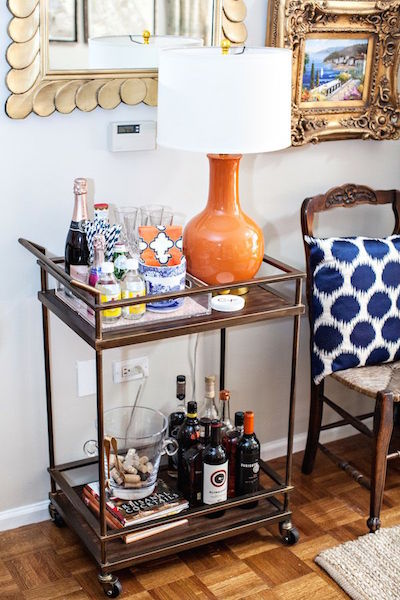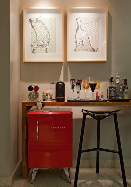 O mini bar pode e deve estar junto a área social da casa (nada de corredores ou cozinha). Você pode colocar uma bandeja sobre um aparador ou ter um carrinho bar.