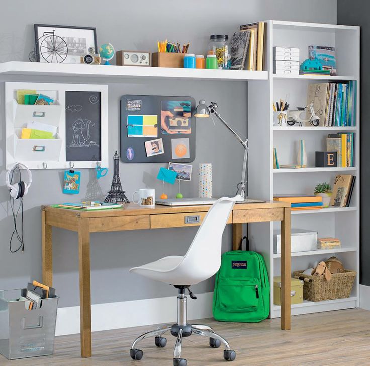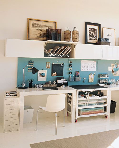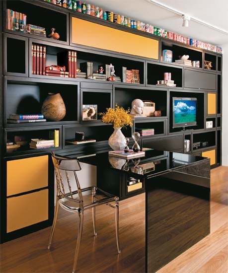 Aqui a sugestão é utilizar elementos que despertem a inspiração sem ampliar a distração (a televisão fica em outro lugar, não aqui viu?). Quadros, enfeites, murais de recados, livros, e organizadores são destaque.