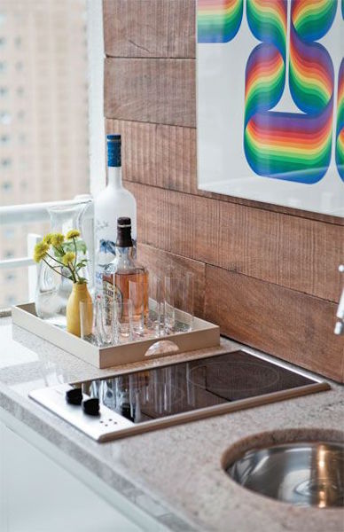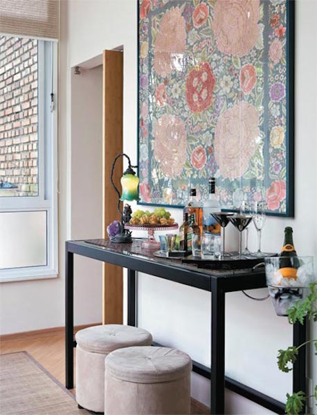 O mini bar pode e deve estar junto a área social da casa (nada de corredores ou cozinha). Você pode colocar uma bandeja sobre um aparador ou ter um carrinho bar.