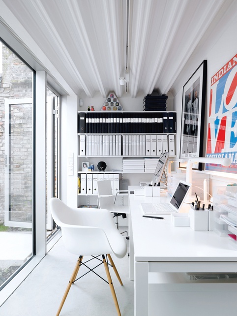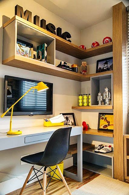 Aqui a sugestão é utilizar elementos que despertem a inspiração sem ampliar a distração (a televisão fica em outro lugar, não aqui viu?). Quadros, enfeites, murais de recados, livros, e organizadores são destaque.