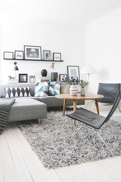 Se seu ambiente for muito estreito ou comprido, opte por colocar o tapete em frente ao sofá.